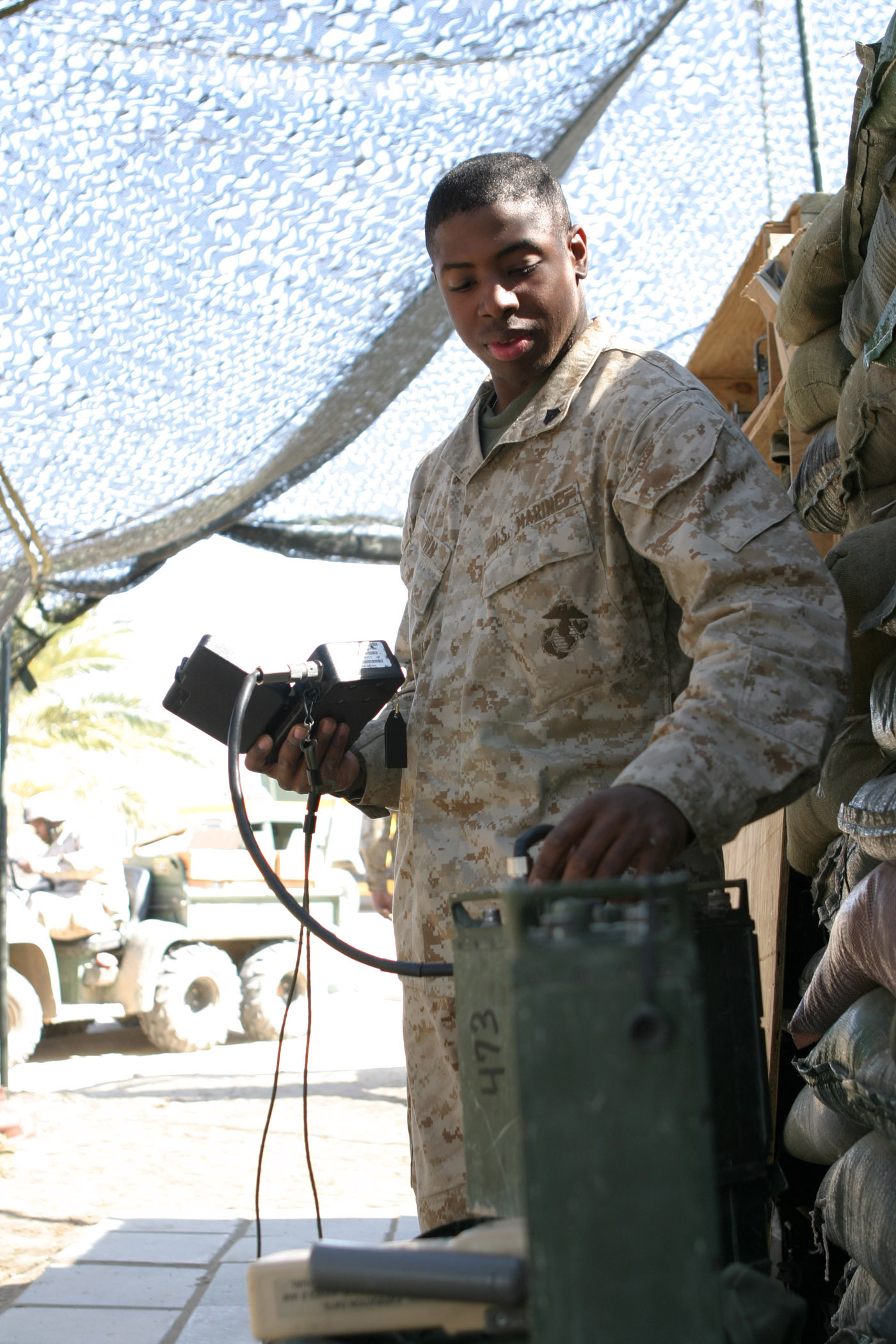 CAMP BLUE DIAMOND, AR RAMADI, Iraq -- Corporal Dexter Brown, a 20-year-old field radio operator, West Memphis, Ark. native and 2002 graduate of West Memphis High School, teaches Marines of Headquarters Battalion, 2nd Marine Division how to use the Personnel Radio Component 119 (PRK-119) system, March 24. The VHF radio is the Corps' main mode of communication in ground combat operations for Operation Iraqi Freedom. U.S. Marine Corps photo by Sgt. Stephen D'Alessio (RELEASED)