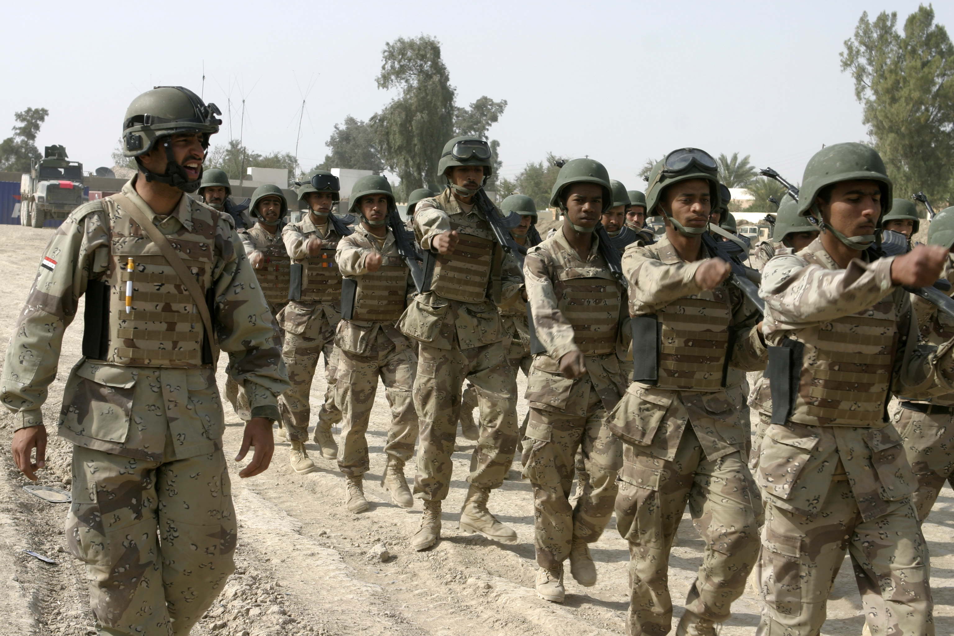 FALLUJAH, Iraq - Sgt. Shaheed Header Raheem, a soldier with the 2nd Battalion, 2nd Brigade, marches his troops around a compound here to teach them basic drill movements. Iraqi Security Forces personnel are working side-by-side with 1st Battalion, 6th Marine Regiment to conduct a "Lion Training" program to teach new Iraqi army recruits fundamentals of marksmanship, first aid in combat, and military customs and courtesies.