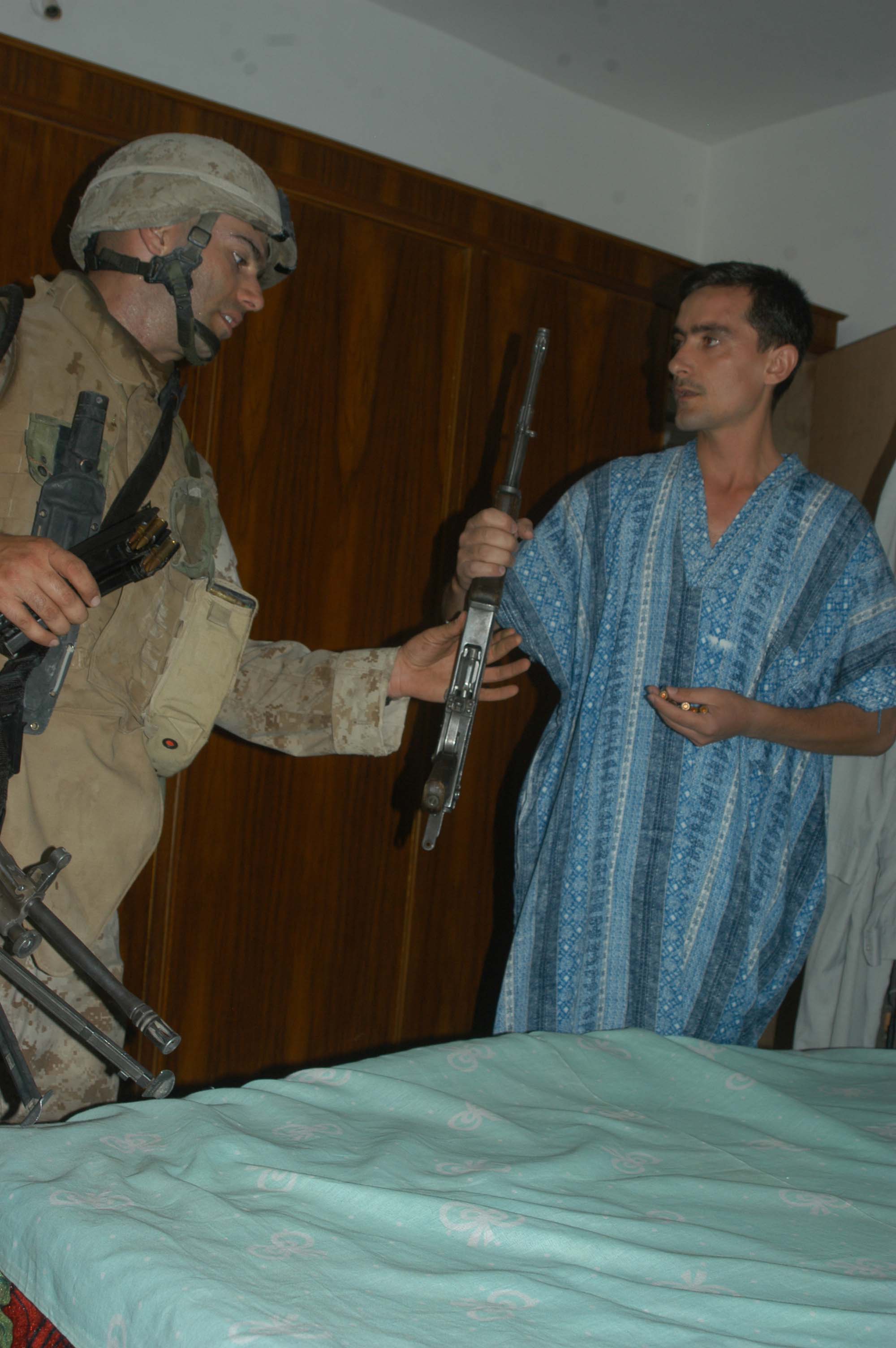 AR RAMADI, Iraq (May 29, 2005) - An Iraqi man hands Lance Cpl. James E. Evans, a squad automatic machine gunner with 3rd Squad, 4th Platoon, Company A, 1st Battalion, 5th Marine Regiment, an AK-47 so he can inspect it during a mission in the city here. The 25-year-old from St. Louis and his fellow squad members searched several houses for weapons caches and questioned residents if they knew of insurgent activity. They also conducted a brief patrol through the marketplace where they talked to storeowners and shoppers and questioned them about insurgent activity. Photo by: Cpl. Tom Sloan