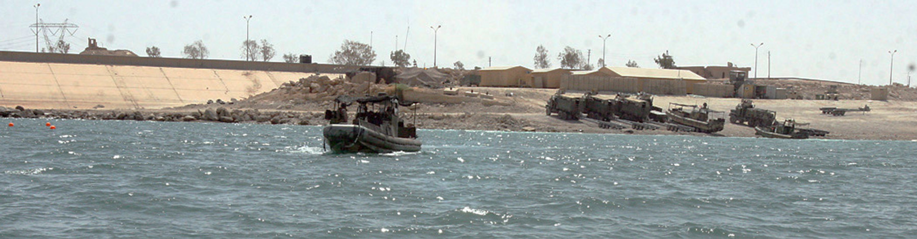 HADITHA DAM, Iraq, (Sept. 16, 2007) – A riverine patrol boat with Detachment 3, Riverine Squadron 1, Riverine Group 1, Navy Expeditionary Combat Command sets off for a patrol on the North shore of the dam. In the distance riverines prepare more of the squadrons boats for patrols and operations. The squadron is the first Navy riverine unit to be forward deployed by the Navy since the Vietnam War. Official Marine Corps Photo By Cpl. Ryan C. Heiser.